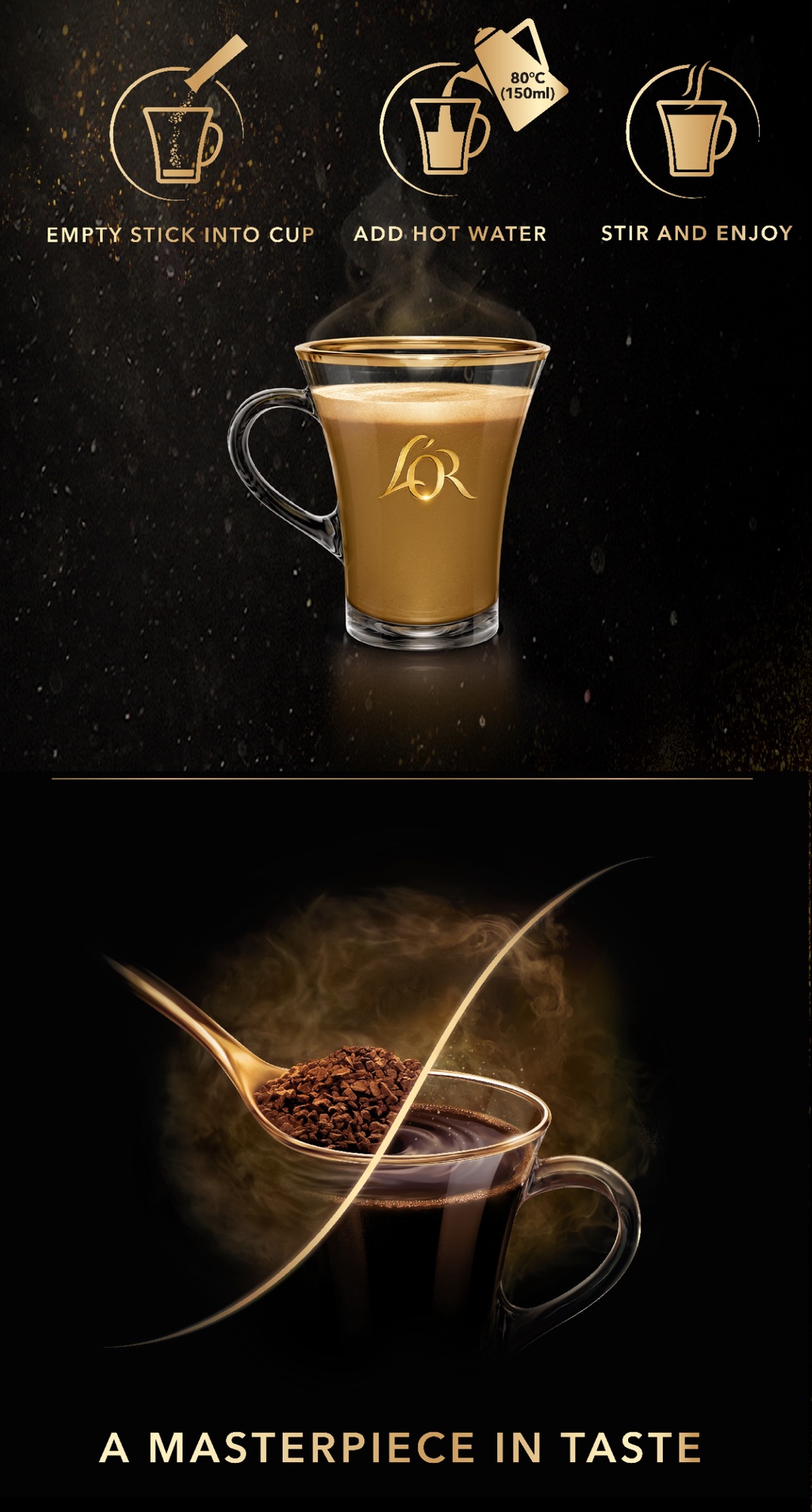 • Prepare the perfect cup of L’OR ESSENSO coffee: Empty contents of stick into a cup. Add 150ml of hot water 80°C. Stir and enjoy.