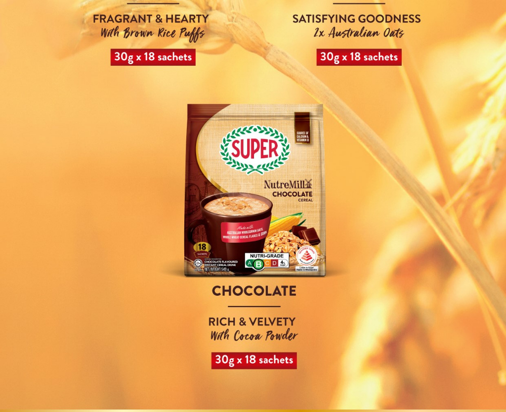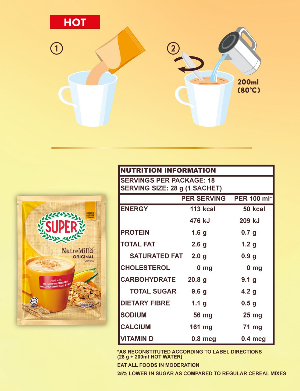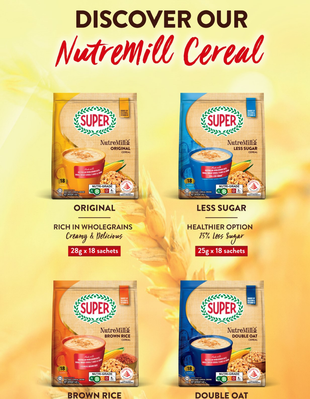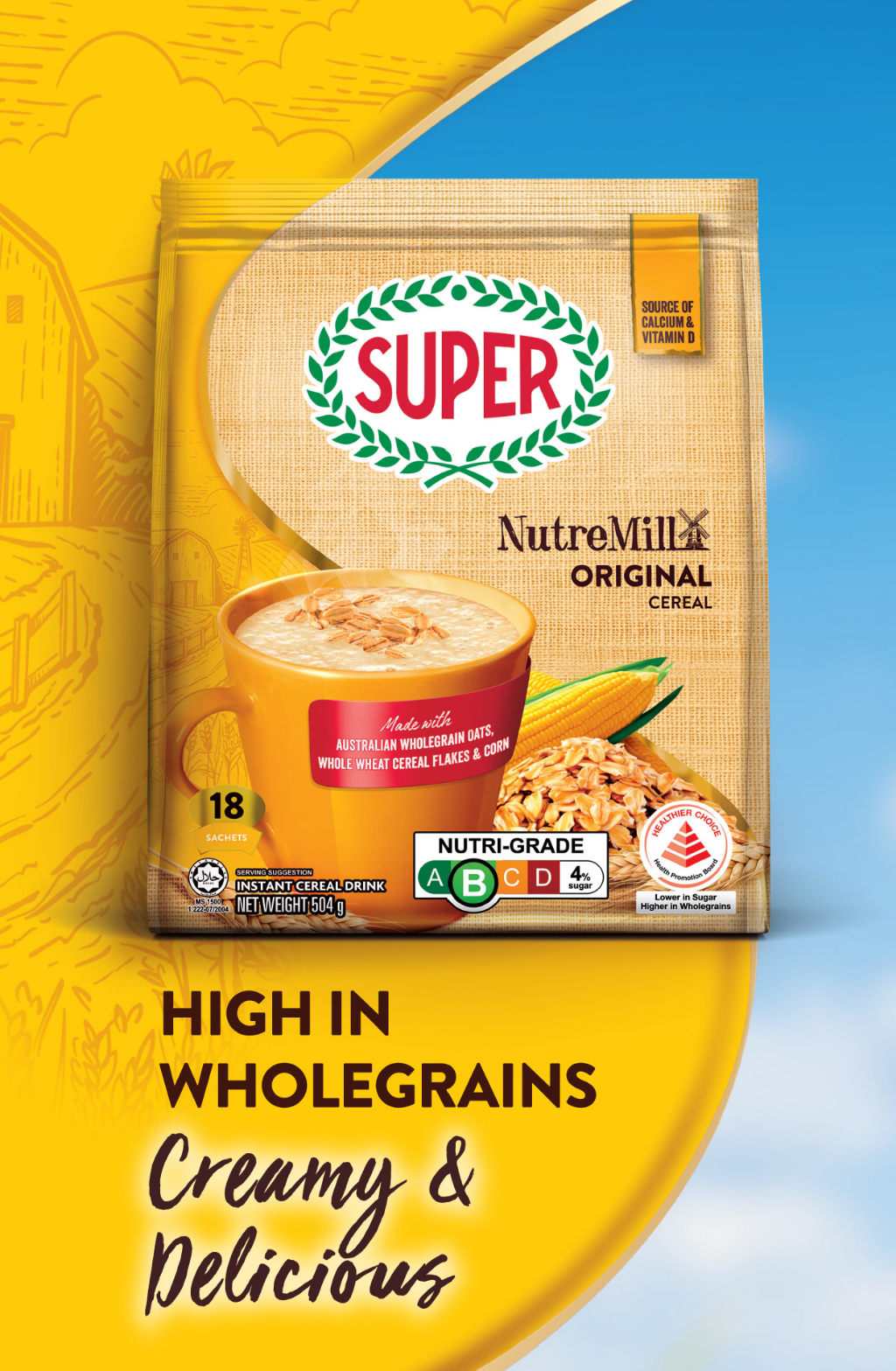 SUPER NUTREMILL Original Cereal is an inviting cup of crispy cereal flakes and Australian Oats with creamy deliciousness. 1 serving of NutreMill Original cereal will provide you with 21% of your daily wholegrain requirement.